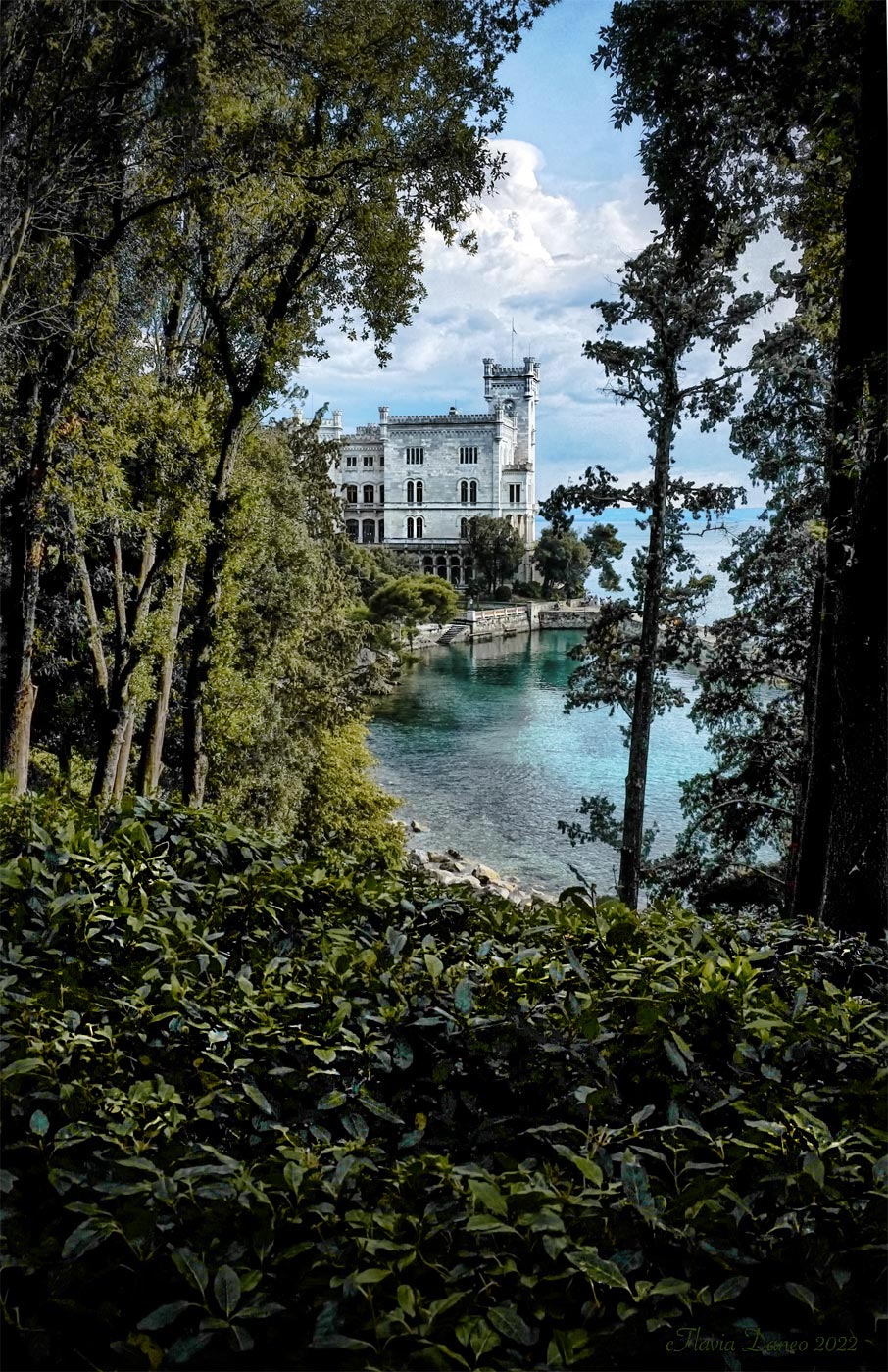 Le tinte fredde sono quelle reali, non sono intervenuta, mi parevano adatte. Ho aperto però un po' le ombre della vegetazione che era, ovviamente, molto in ombra. È proprio l'ampia cornice di verzura che mi ha solleticato ( e che quindi non ho voluto eliminare) perché mi pareva si addicesse all'atmosfera ottocentesca e alle aspettative dei nobili abitanti del Castello