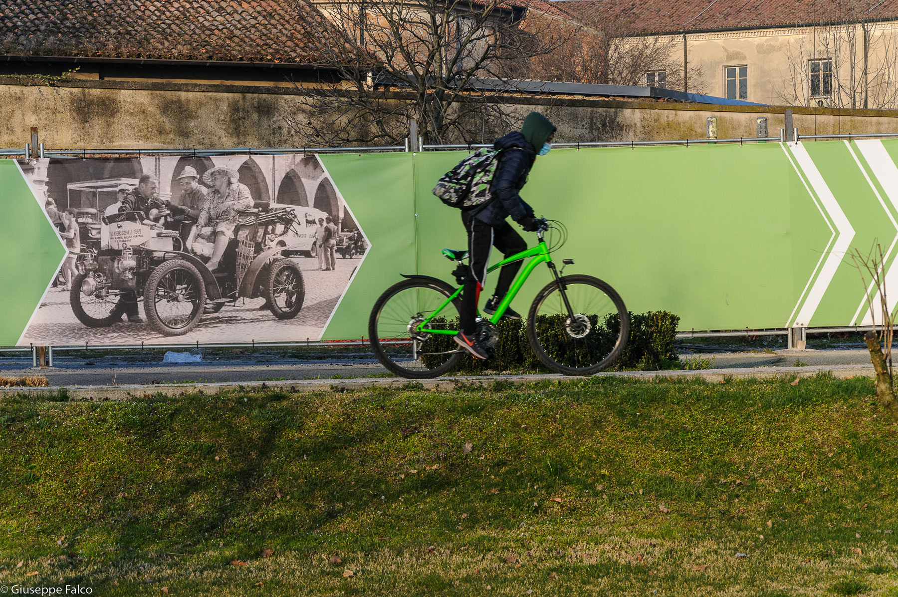 Un ciclista a colori che sfreccia davanti ad una scena d'epoca a quattro ruote in bianconero. Tra le due scene non c è' un collegamento diretto: entrambi vanno in direzione opposta, ma l'autore ha saputo cogliere questa istantanea in modo spiritoso e gradevole. Mi piace