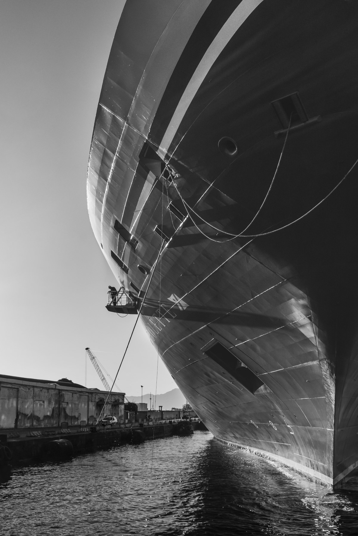 Punto di ripresa e grandangolo rendono perfettamente la mole della nave.Ottima composizione e molto bello il bn. Ciao,Sergio.
