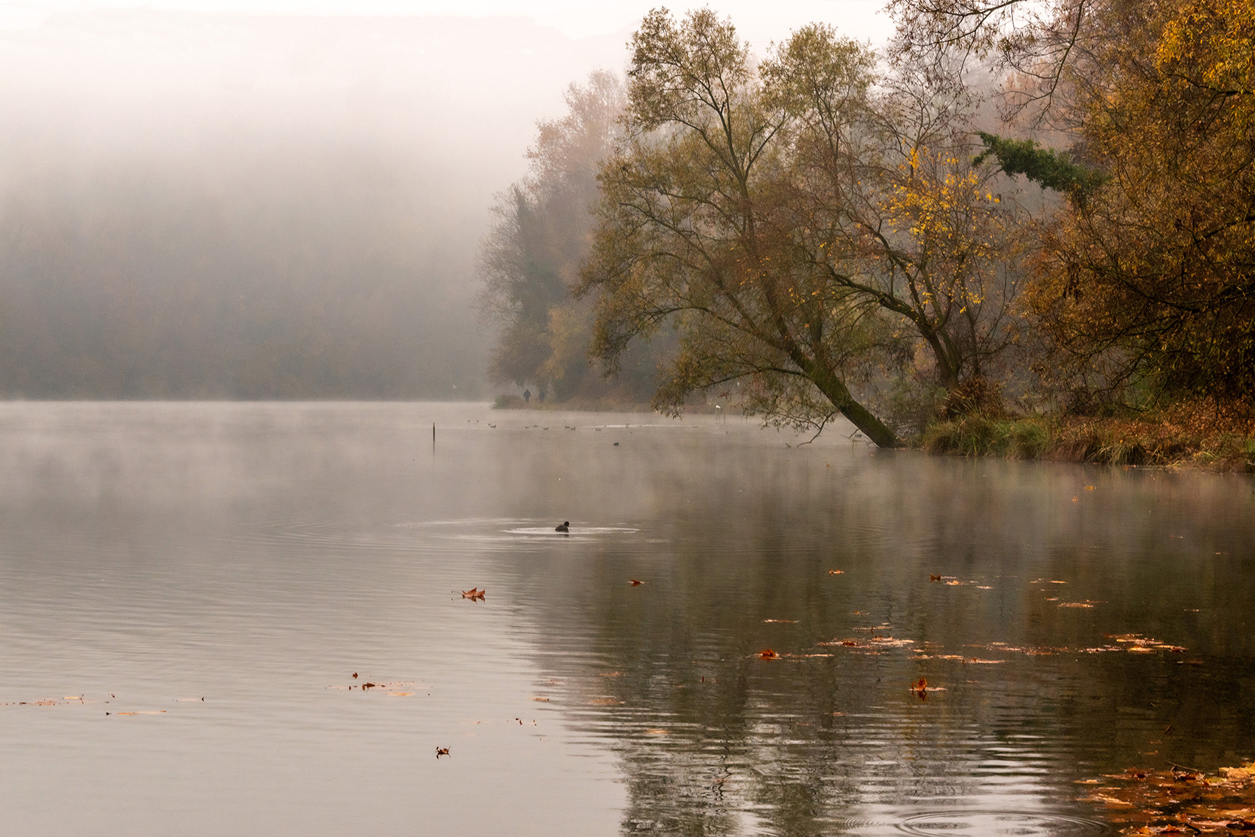 Un angolo d'autunno avvolto nella foschia, bello scatto.