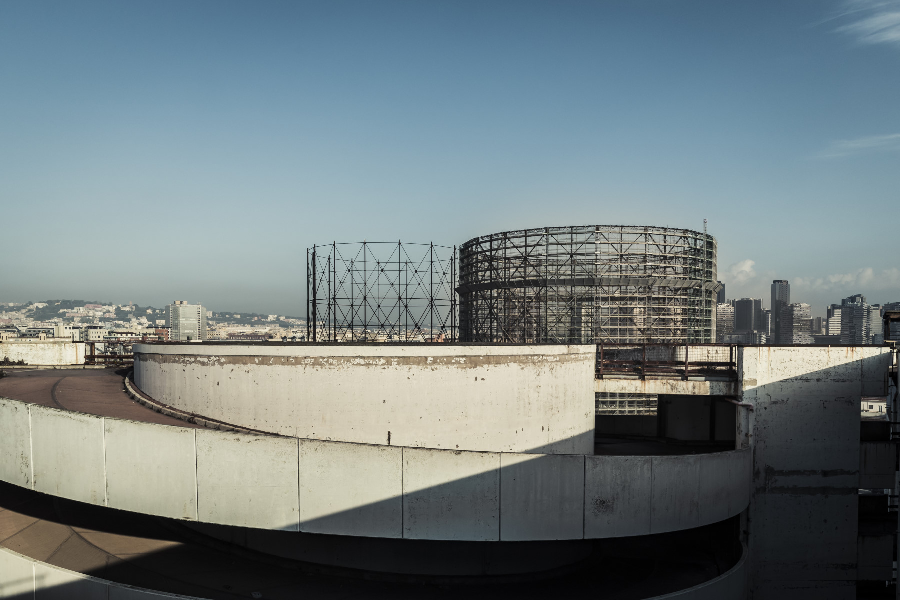 Composizione attenta e pensata, l'ombra diagonale che parte dall'angolo, l'affinità di forme circolari, il paesaggio di differente stampo a sinistra e a destra delle strutture.