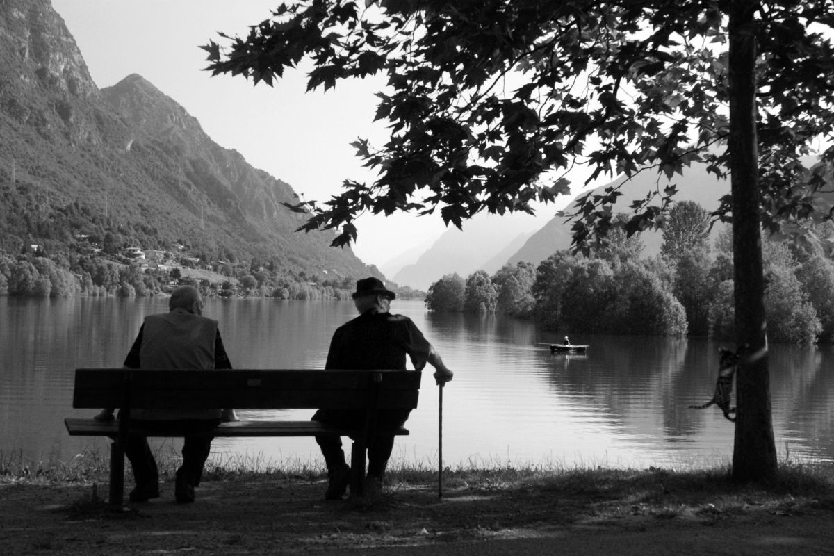 Due anziani che si godono il paesaggio, la natura, il silenzio, attratti poi dal gatto che si arrampica sull'albero. La barchetta sulle acque calme a completare il quadretto. Bello il BN e la scena ripresa. Uno scatto che funziona.