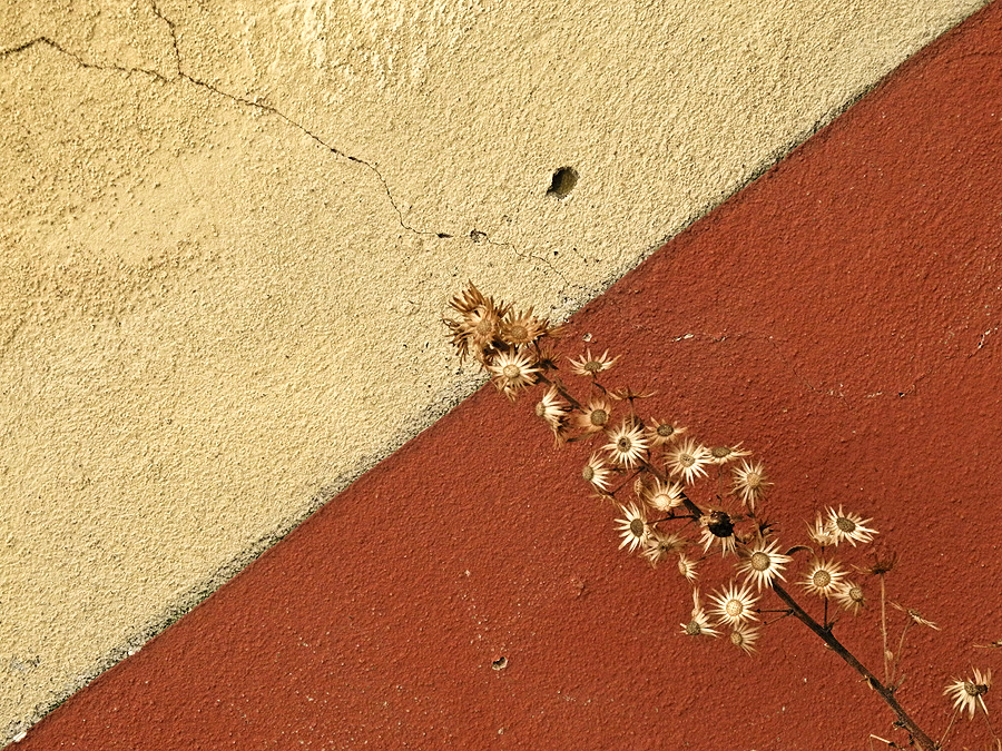 Una piacevole composizione, il fiore che punta dritto al rigo della crepatura.. ottimi anche le tonalità dei colori. Ben vista.