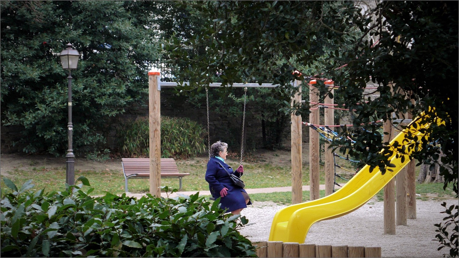 Da anziani si torna un po bambini. Il bambino non si vede ma la sua presenza è tangibile e si materializza con lo scivolo e sopratutto con lo sguardo attento della nonna. Ottimamente colta