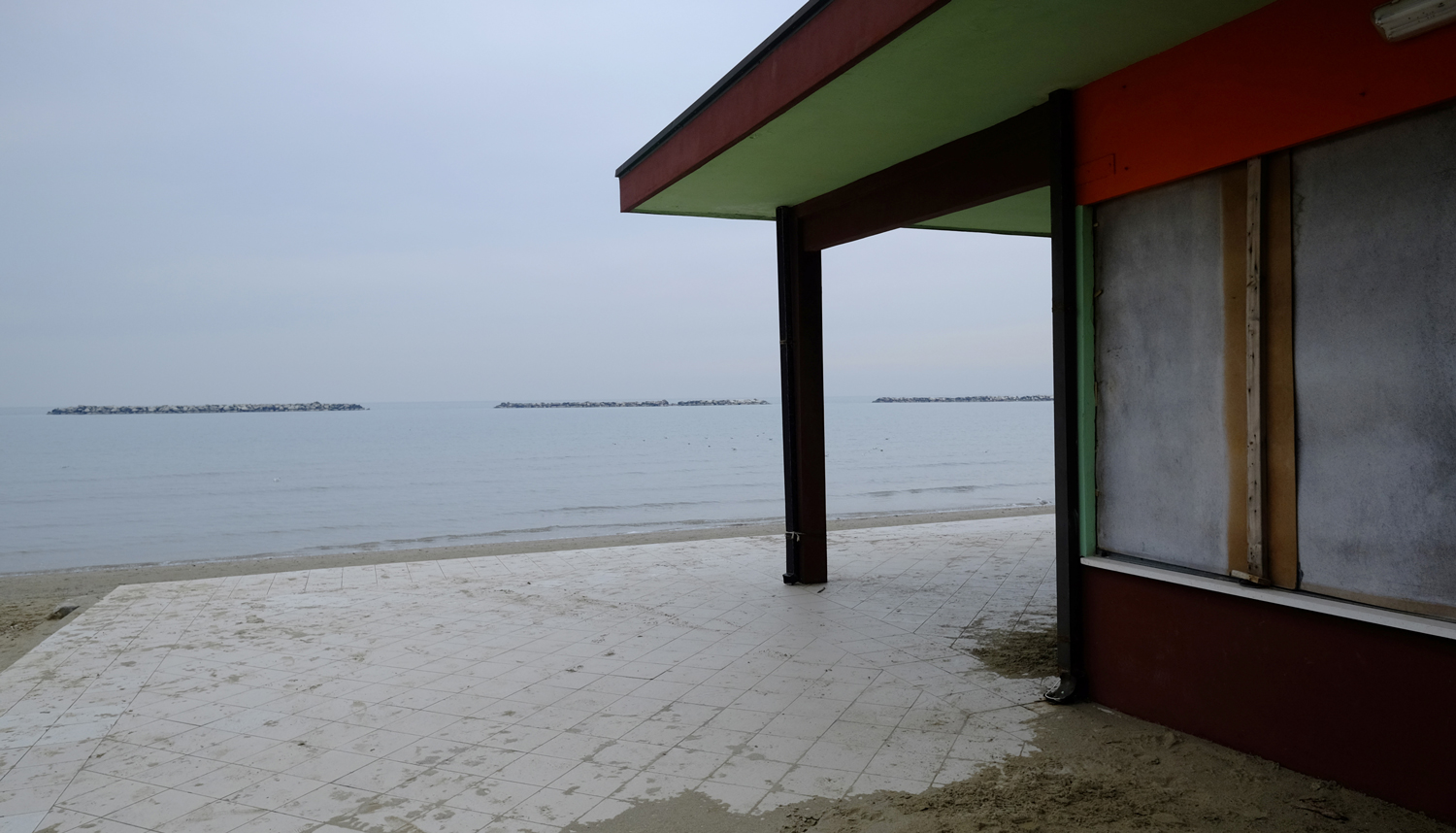 Una buona veduta marittima invernale con le linee guida del ristorante bar chiuso e con i ripari termici a condurre lo sgurdo verso la linea dell'orizzonte e a costituire in sè una chiara ambientazione del luogo e del momento dello scatto.