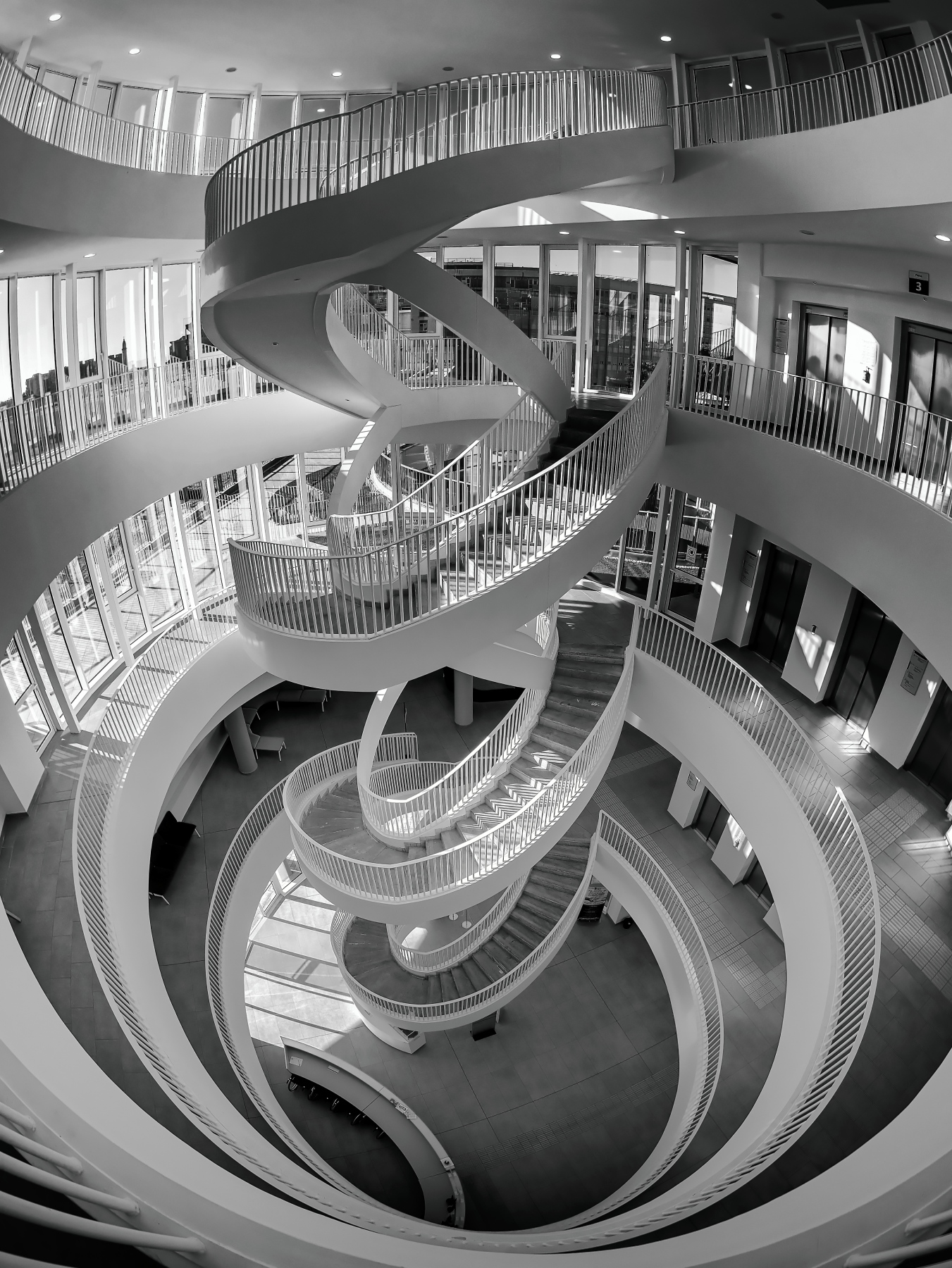 Una struttura interna con una doppia scala elicoidale dall'andamento irregolare e alquanto eclettico.
