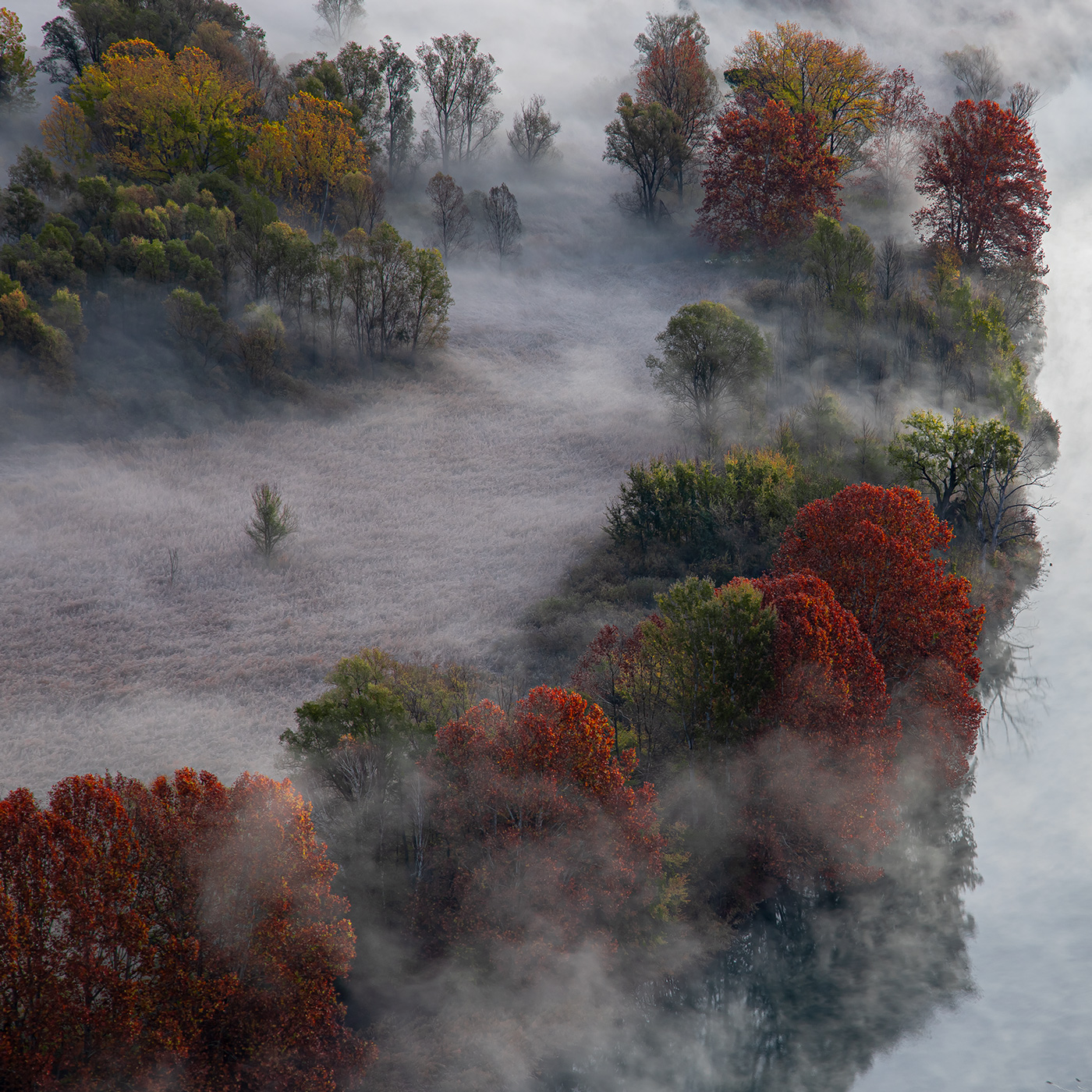Il contrasto tra la nebbia al suolo e i colori caldi dell’autunno è davvero molto suggestivo… Originale e convincente anche il taglio quadrato Mi piace molto