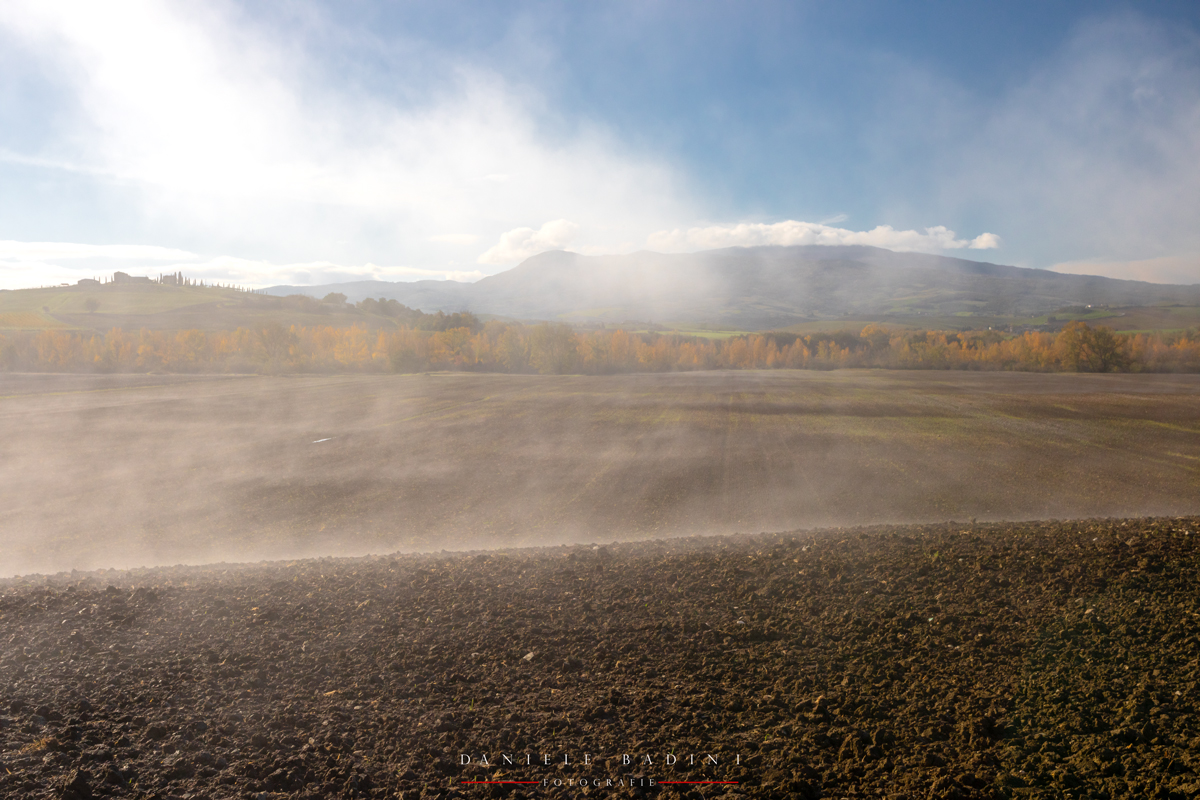 Mi piacciono i vari strati e piani che si susseguono interrotti dalla fascia di alberi dai colori autunnali, il tutto amalgamato dalla leggera nebbiolina che fa da collante.