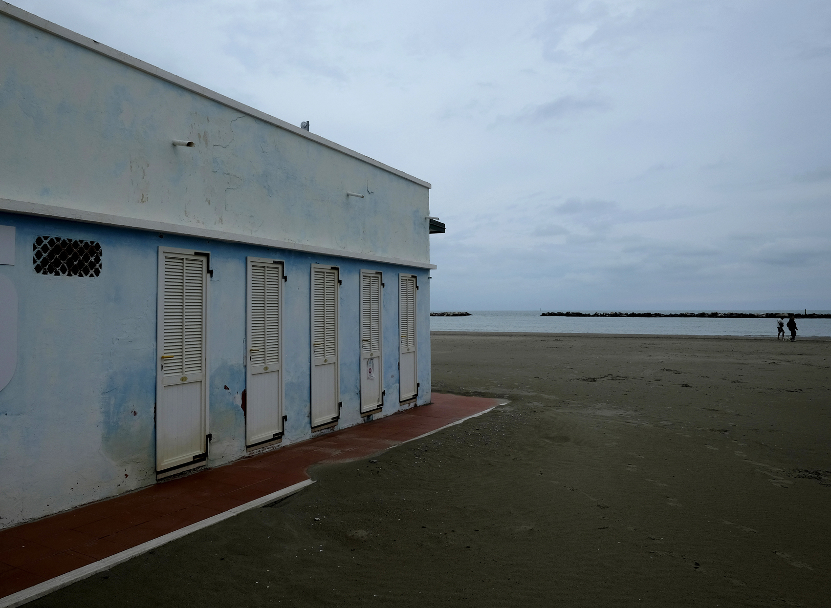 Emerge dal fotogramma una attenta composizione, la prospettiva dell'edificio e la presenza umana realizzano un'ottima fusione con la linea dell'orizzonte e dei frangiflutti.