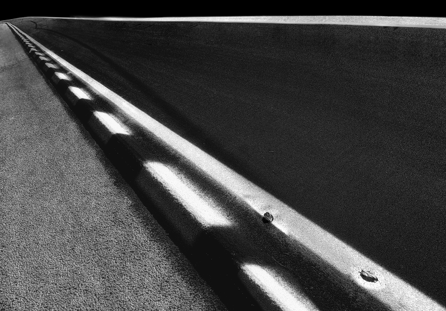 In una foto così stilizzata e giocata sulla vertiginosa prospettiva del manto stradale quelle due foglie sono veramente un elemento disatteso che lo umanizza in qualche maniera.