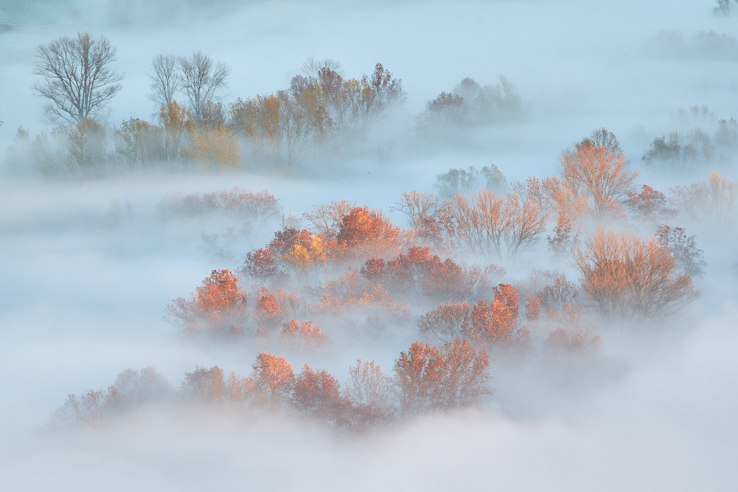 | Su un morbido tappeto di nebbia galleggiano tenui vibrazioni cromatiche. Bellissima...ciao Gianni. |