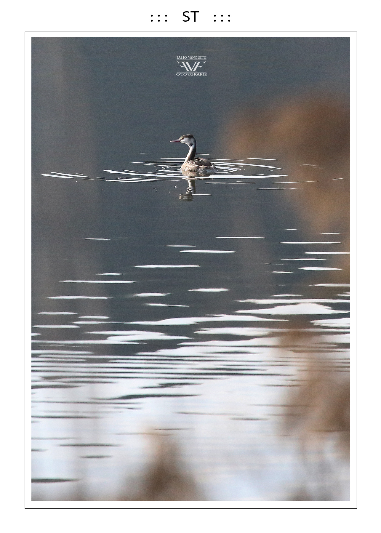 Perché varie e non natura? Mi piace il senso di riservatezza e rispetto che si respira nell'osservare il nuoto lento del pennuto, e sicuramente le fronde fuori fuoco aiutano questa sensazione, sono funzionali. Solo un leggero dubbio sul fatto che forse il disturbo sia un po' eccessivo, soprattutto quello delle bande verticali, forse sottili fili d'erba ..