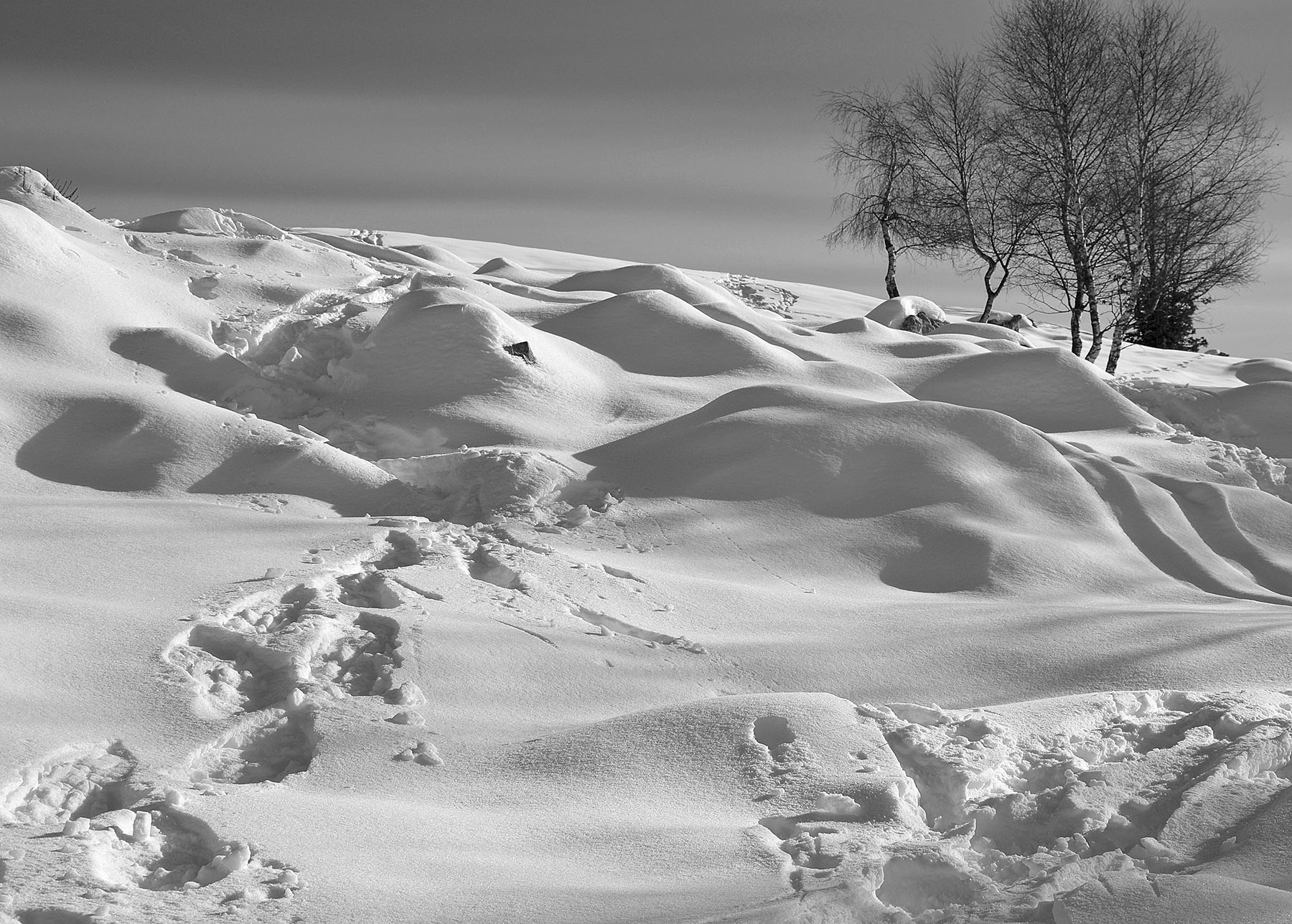 La morbidezza ed il bianco delle piccole dune nevose che si contrappone alla nitidezza degli alberi scuri, le orme che escono dalla scena nell'angolo, un viraggio accurato che ben si confà con l'ambientazione, anche il cielo stratificato, tutto delizioso ed accurato.