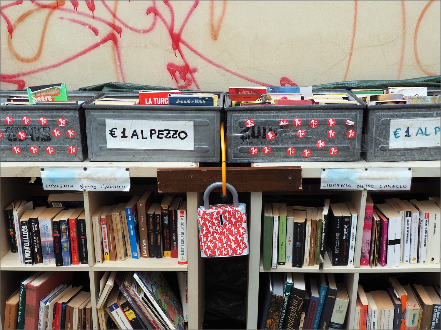 I libri riposti negli scaffali, quelli riposti nei contenitori e i graffiti sul muro fanno pensare ad un venditore ambulante che magari esercita la professione in un mercatino. Anche i libri a basso costo vanno in questo senso. Bene! Ci presenti uno spaccato colorato, di questa attività e lo fai con gusto.