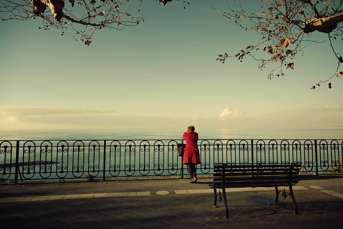 La tonalità verde turchese e intrisa di giallo che hai conferito al cielo sul mare e al mare stesso creano un perfetto partner cromatico al rosso del giaccone indossato dalla donna che rimira il panorama. Una bella foto di litoranea. Bravo come sempre. Ciao, Tiziano