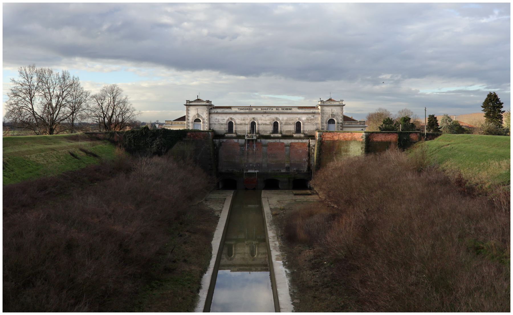 La prospettiva, veicolata dal canale con i bei riflessi e la secca vegetazione ai suoi lati, è molto bella. Incontra una struttura che si armonizza con l'ambiente circostante. Ai suoi lati gli alberi e il verde, gli danno un sapore campestre. Il cielo con le sue tinte con gradazione di grigio coprono il celeste che a tratti si intravvede, è in sintonia con i colori circostanti.