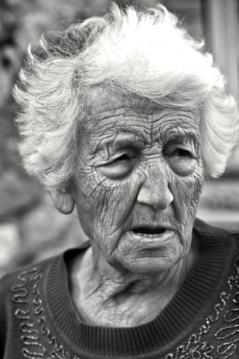 Intanto per la valutazione dell'immagine e delle sue non perfezioni o requisiti ideali bisogna partire dalla constatazione ambientale e contingente al momento dello scatto. Come hai ben intuito si tratta di uno scatto preso al volo, un ritratto verace che è una istantanea piuttosto che lo studio di un volto o di un ritratto in studio e dunque c'è il bisogno di mediare le situazioni di luce e di movimento del soggetto non in posa che spesso non sono proprio quelle preferibili. Qui mi trovavo in un caratteristico e amabile borgo della campagna pisana chiamato Santaluce e il frutto dello scatto è un incontro casuale in una stradina dello stesso con la mia solita empatia che cerca di avvicinare e conversare con le persone in maniera estemporanea e avere uno scambio umano che per me è la cosa fondamentale al di là dello scatto fotografico. Anche qui avvenne con questi presupposti di base. La donna si mise a conversare con me e poi di seguito con la mia compagna e la mia bambina che sopraggiunsero di lì a poco. Estraniandomi per un attimo dalla conversazione notai la particolarità del volto dell'anziana signora molto corrugato e dunque pensai di ricavare una foto per ricordarla. Per non disturbarla misi su il 70-200mm F2,8 (un signor obiettivo) e cominciai a focalizzarla. La donna si trovava in un punto del vicolo in cui da basso entrava una luce di sole a lama piuttosto intensa e cadeva proprio sulla sua testa canuta e ovviamente sul bianco la luce ha generato una certa sovraesposizione che a mio avviso seppur non ideale è accettabile nel contesto dello scatto ripreso dal vivo on the road. Voglio dire in un ritratto del genere non lo reputo un requisito fondamentale. Conta piuttosto riprendere l'espressione e l'accento somatico di un volto interessante come il suo. Stava parlando anche animatamente con Monica.