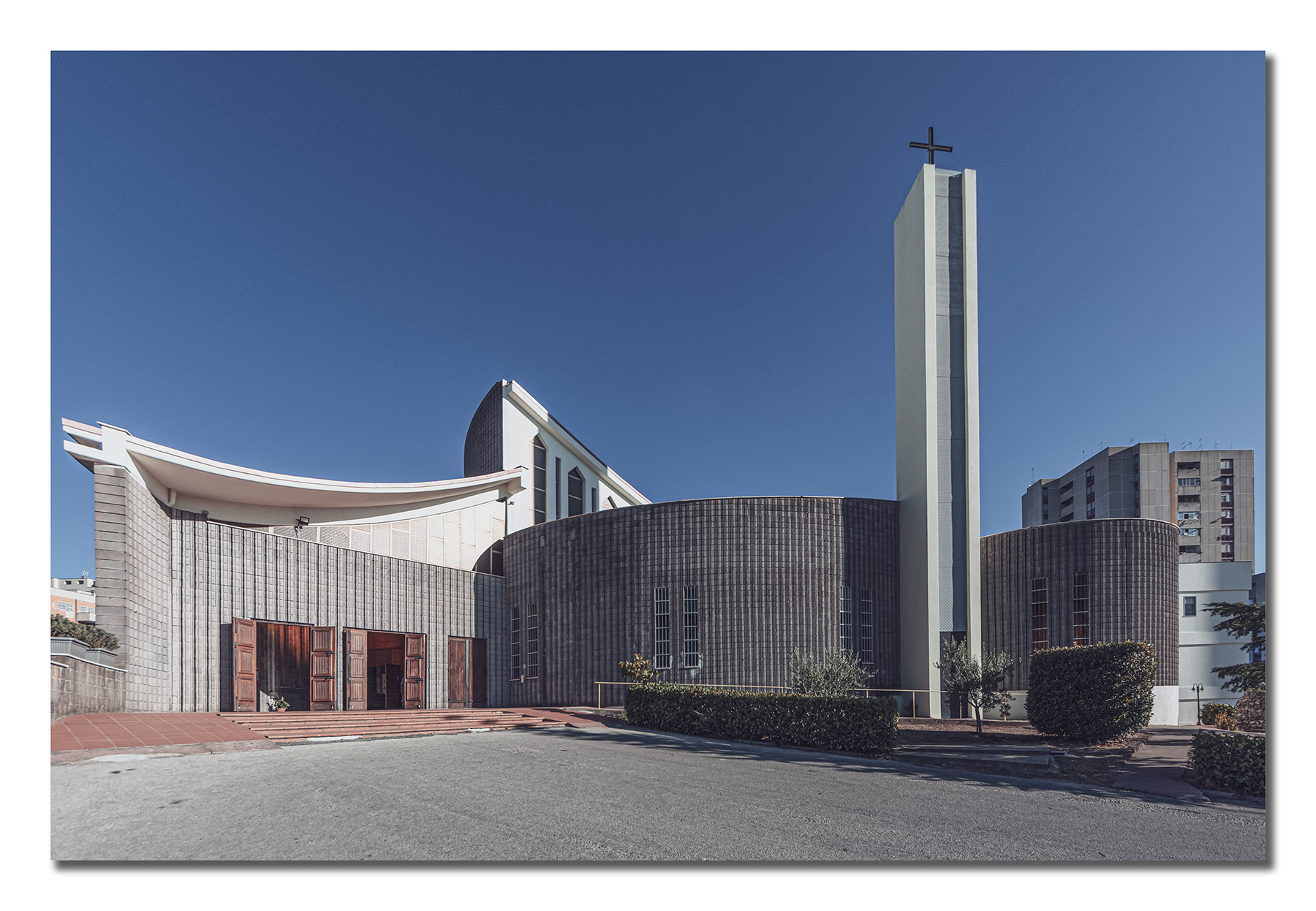 Grazie a tutti per i commenti. Per la ripresa, me ne serviva una ampia per documentare la Chiesa per il progetto che sto portando avanti (www.chiesemoderne.it) è stata difficile perche' con l'8mm (12 su APS-C) ai lati ho sempre dei problemi, se appunto vicino a bordo frame ci sono delle linee rette, ho cercato di raddrizzare il piu' possibile, in basso a destra poi c'è una discesa che non aiuta. Un saluto.