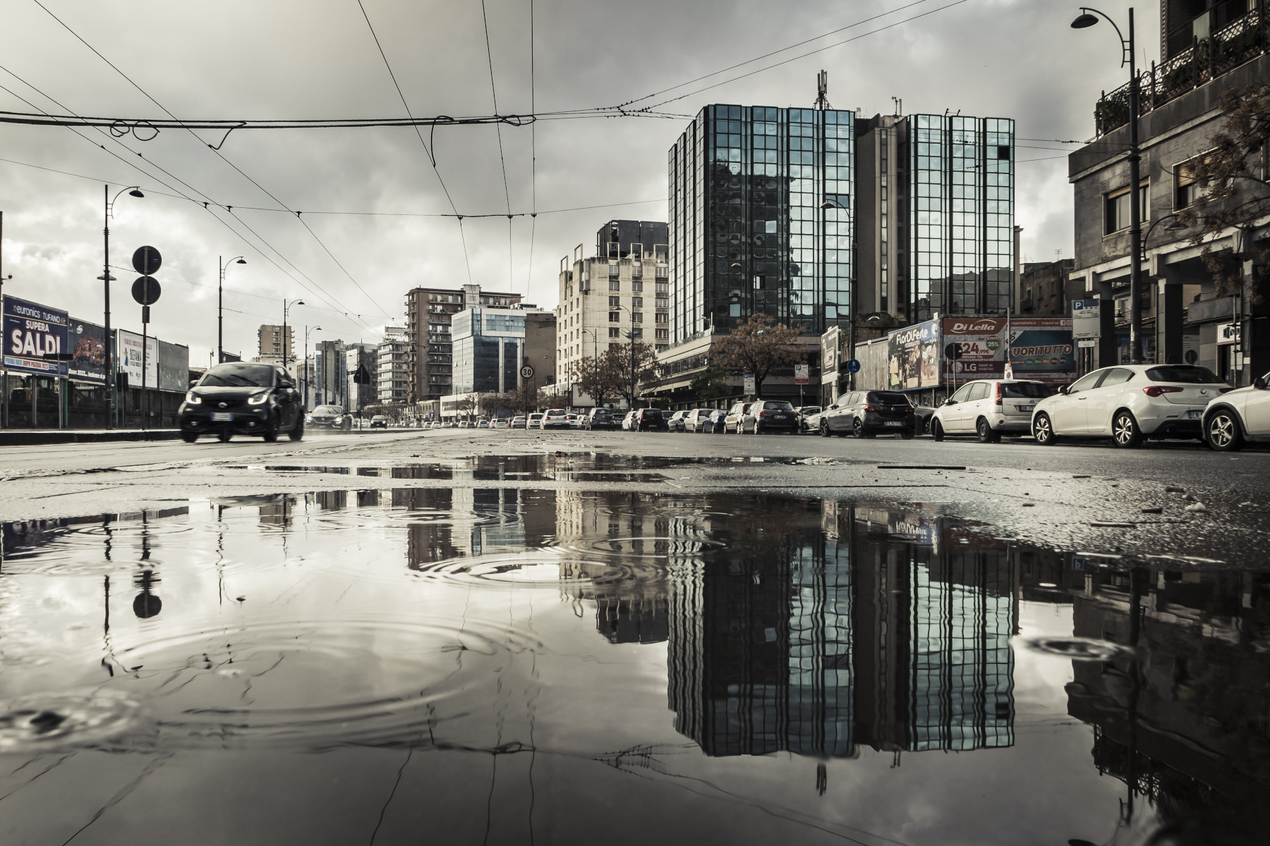 un ottimo scatto di paesaggio urbano ben composto, belli i colori naturali, la pozzanghera con i cerchi nell'acqua è la marcia in più dell'immagine