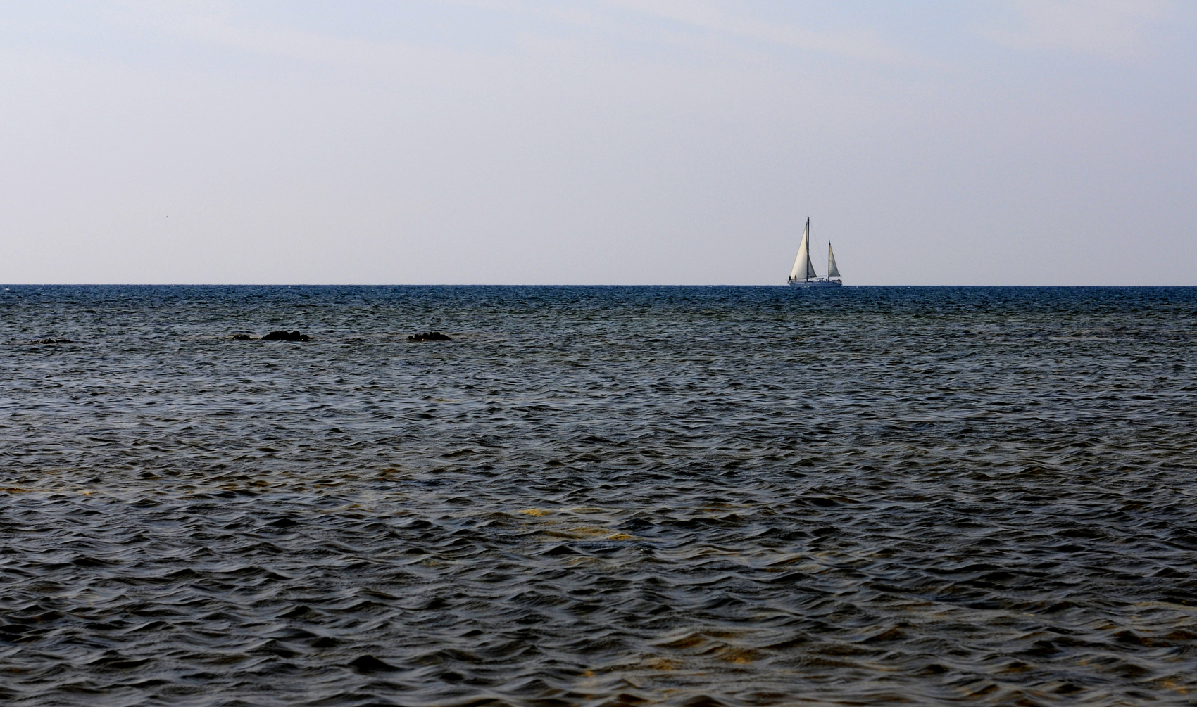 ''Quasi'' perfetta composizione, due cm in meno sopra e sarebbe stata nei terzi canonici, la barca c'è in pieno. Bellissimo il mare con quell'onda ''continua'' appena formata, non conosco l'orientamento ma la velatura ridotta del ketch mi suggerisce un vento di terra, forse un maestrale non troppo forte.  |