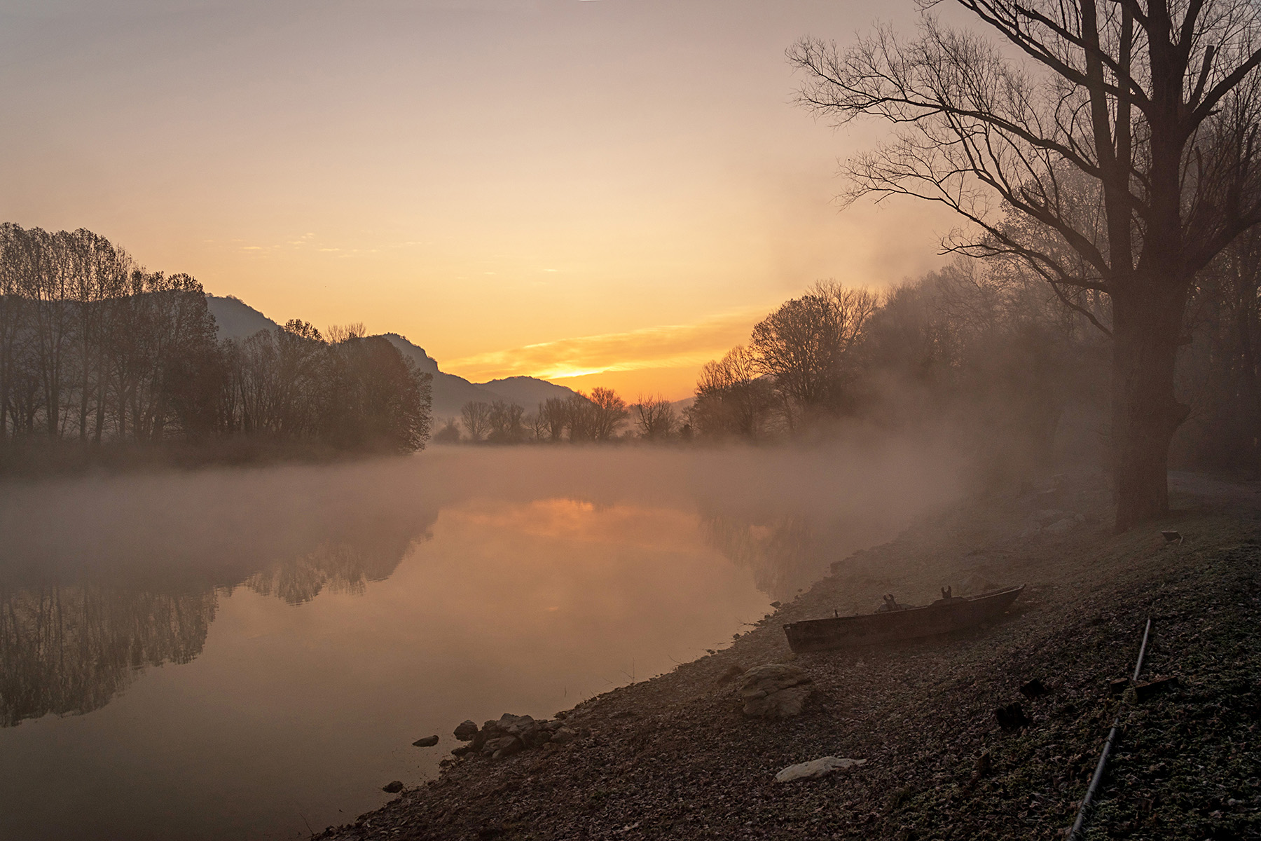 il battello in secca sulla riva, la luce calda che si irradia sul fiume avvolto dalla foschia.