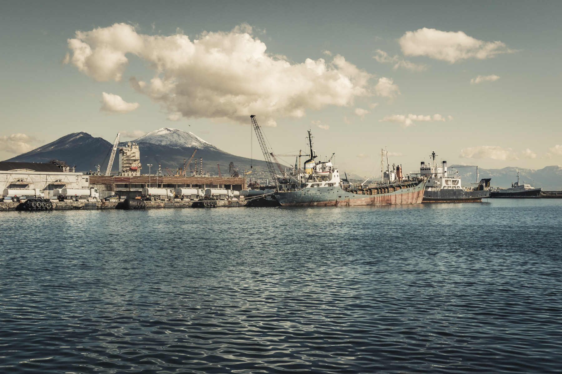 Composizione e colori molti belli, le nuvole sono ottime, sotto il Vesuvio con il cappello imbiancato.. è un bel vedere.