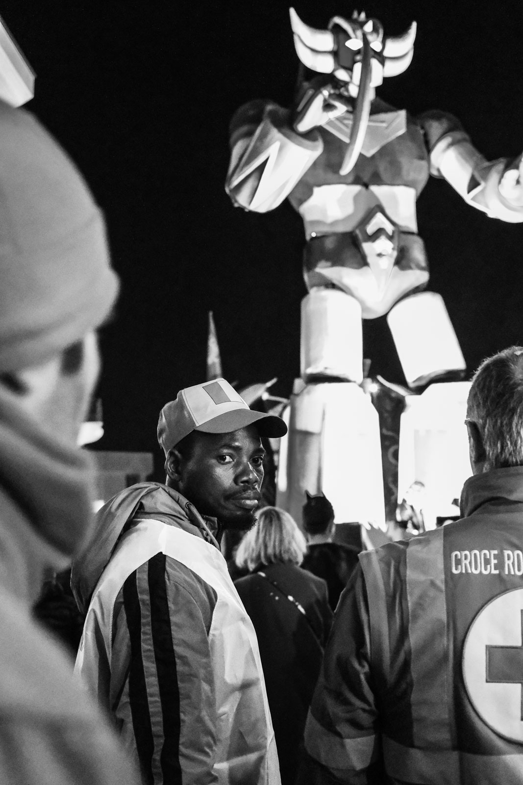 A rigor di regola, il soggetto dell'immagine dovrebbe essere l'uomo di colore, essendo l'unico a fuoco e visibile in volto tra la folla di spalle. Eppure, Goldrake - con tanto di alabarda spaziale sguainata - ruba tutta la scena. Non mi è chiaro cosa tu intendessi rappresentare (abbi pazienza, sarò un po' rintronato: il fatto che sappia riconoscere al volo le armi di Goldrake, fornisce un chiaro indizio sulla mia età ). Attenzione agli elementi di disturbo che spuntano dalle teste delle persone  |