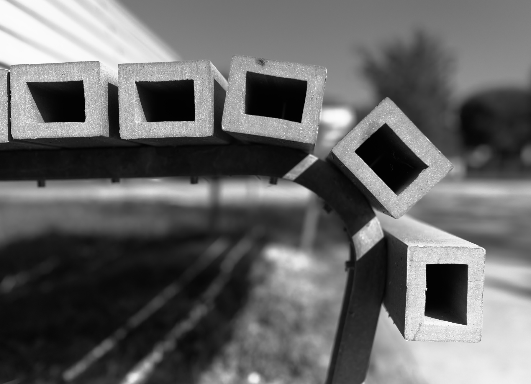 I tubolari poggischiena della panchina in alto a sx sembrano dei fasci luminosi che contribuiscono a rendere interessante lo scatto.