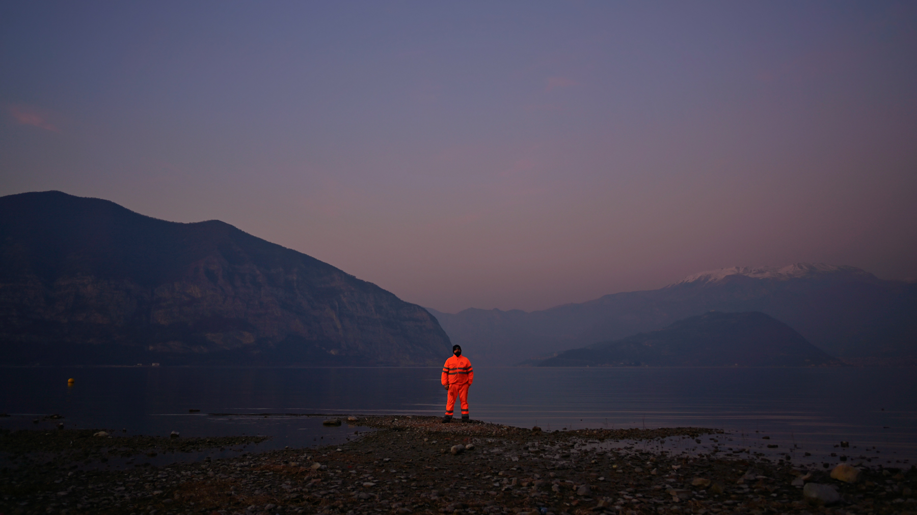 Le cromie non mi persuadono completamente, il contrasto tra l'arancio della tuta ed il paesaggio c'è, ma non è così marcato come a mio avviso dovrebbe essere, forse per la tinta tendente al magenta che domina la scenario.