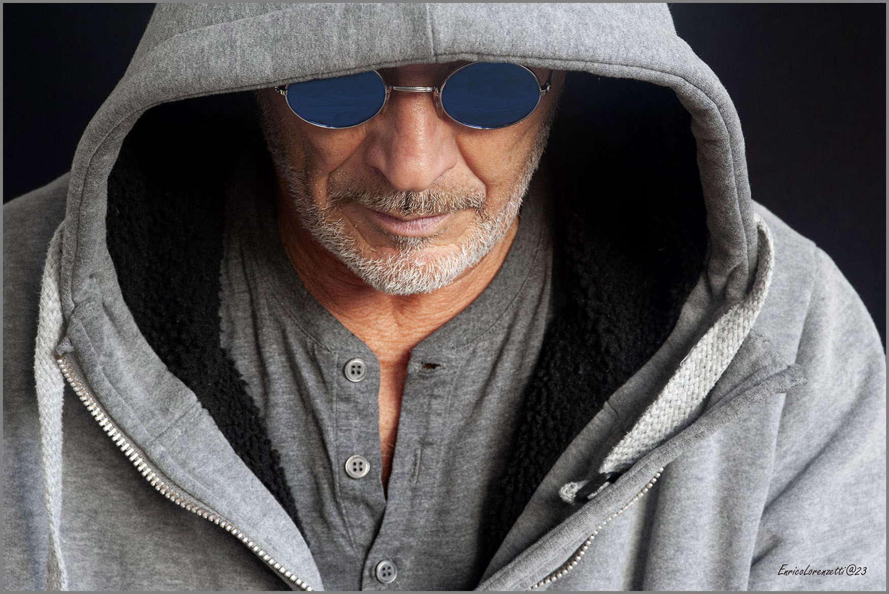 Ottima l'illuminazione e altrettanto buona la posa del viso a chiudersi dentro il cappuccio della felpa, quasi a voler interrompere la comunicazione con il prossimo, ulteriormente comprovata dalla scelta di indossare gli occhiali.