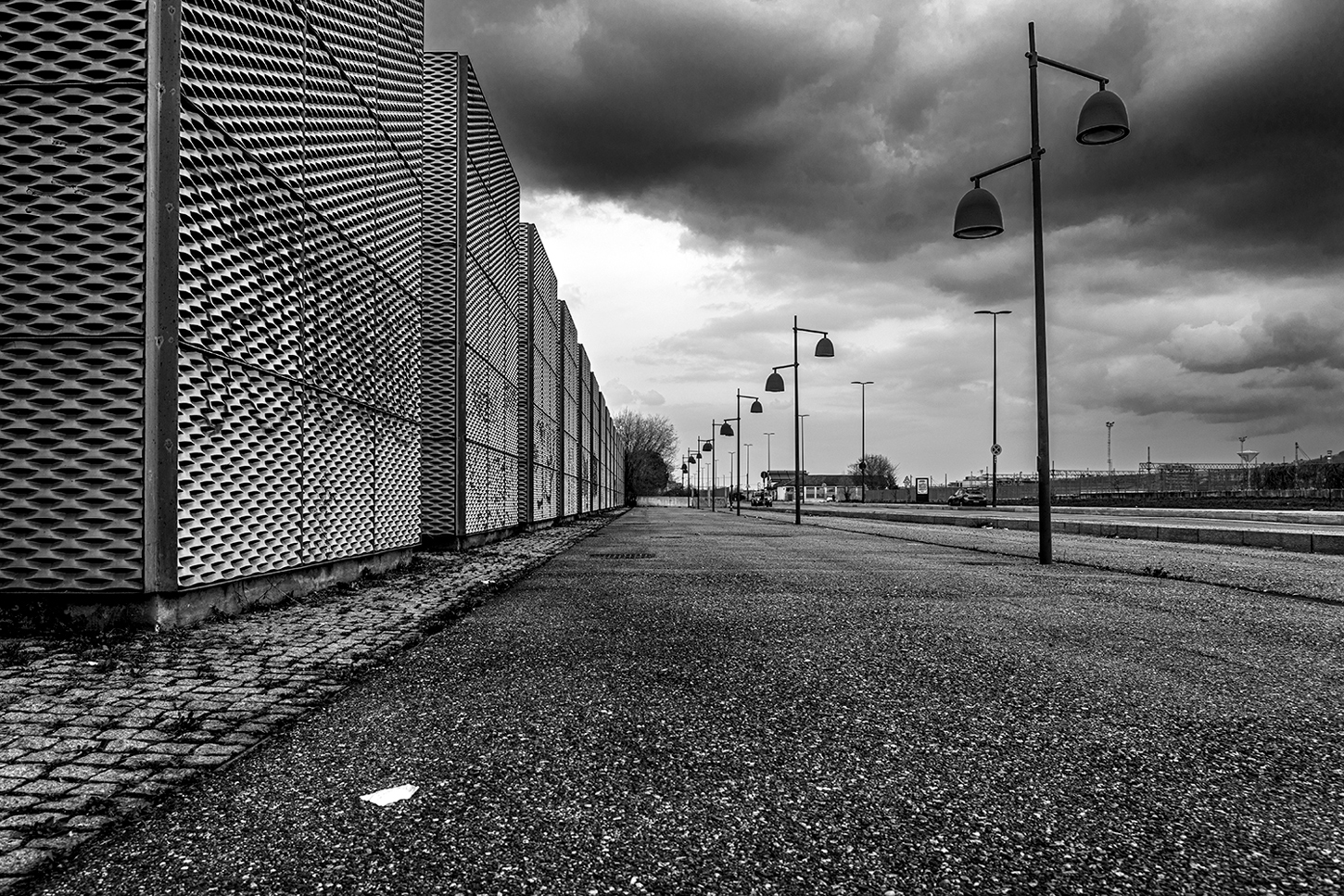 Il bianconero è ottimo. Un cielo carico che cattura lo sguardo, una lunghissima e bella prospettiva di cubi di lamiera e lampioni.