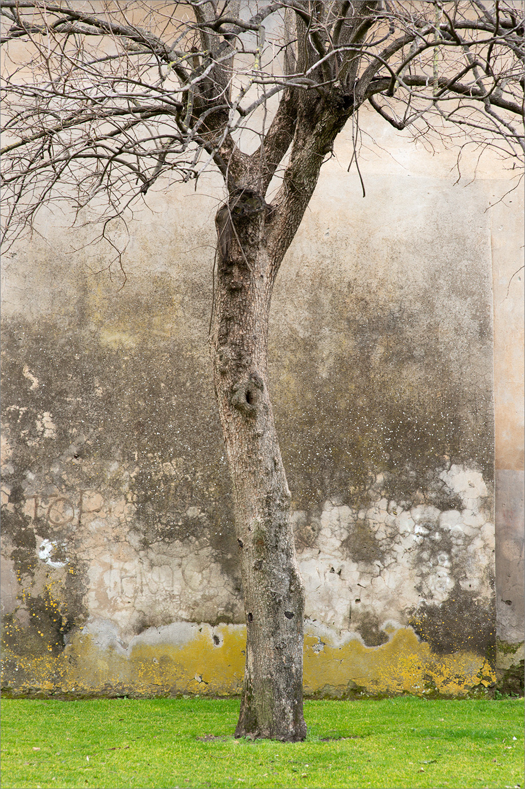 immagine contraddittoria, il verde alla base mentre i rami spogli e grigi sono sopra. Il tronco si confonde, mimetizza, con il muro dietro. la composizione slanciata è leggera come nel tuo raffinato modo di vedere