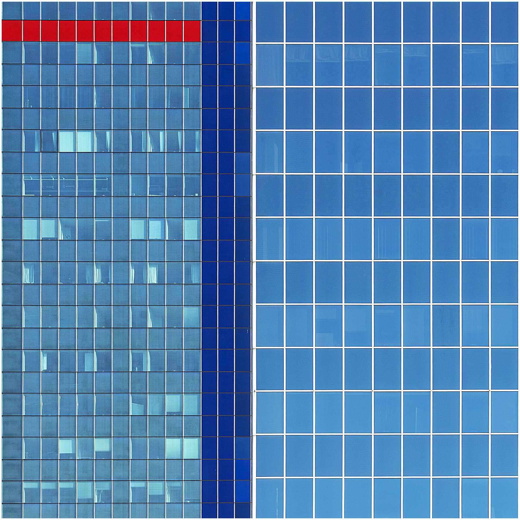 Molto interessante e stimolante questo gioco di rettangoli dalla varie sfumature del ciano/blu, la riga rossa è un tocco di classe notevole.