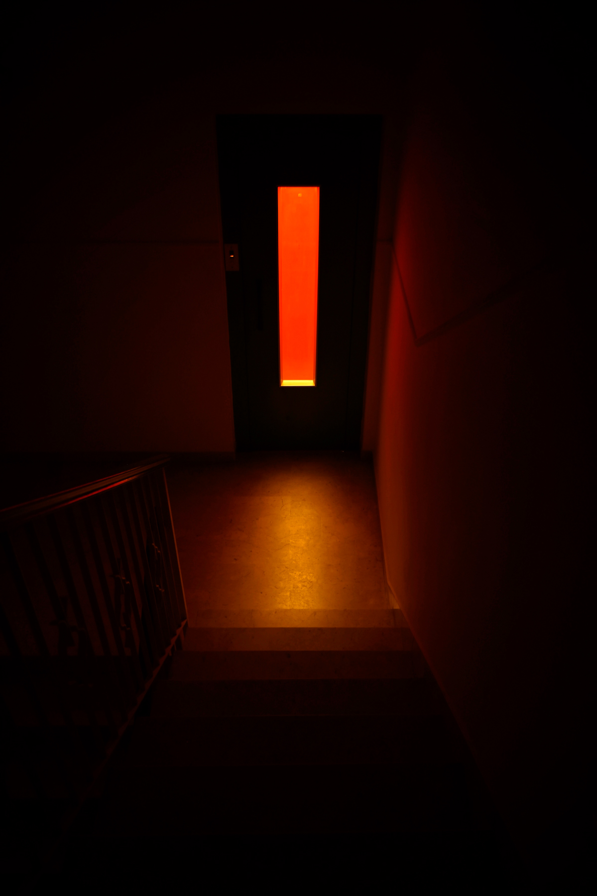 Sono uscito sul pianerottolo prima dell'alba e c'era la luce dell'ascensore al neon che emanava il rosso delle pareti interne.