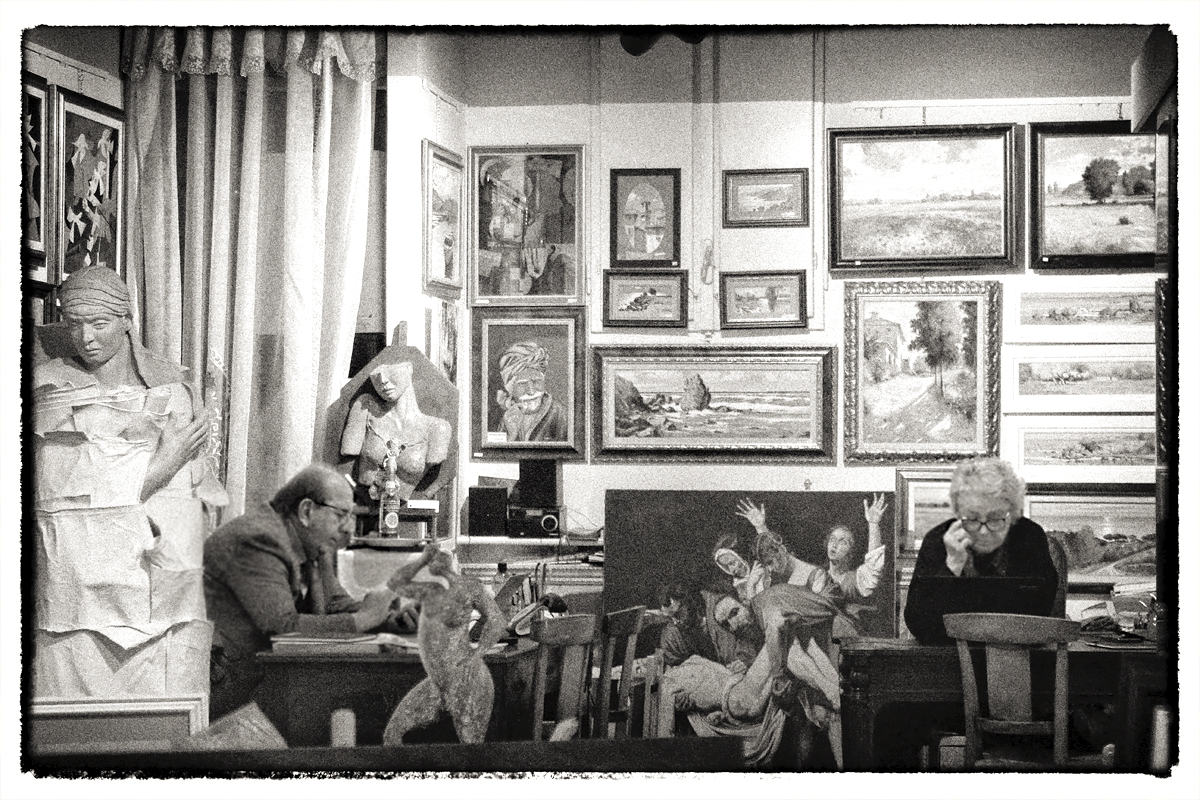 Mi piace tutto di questo scatto. I soggetti sono collocati lateralmente e tra i due l'esposizione di dipinti e sculture che adornano lo spazio. Il BN ben dosato e mi piace anche l'effetto vintage che ha sapientemente applicato.
