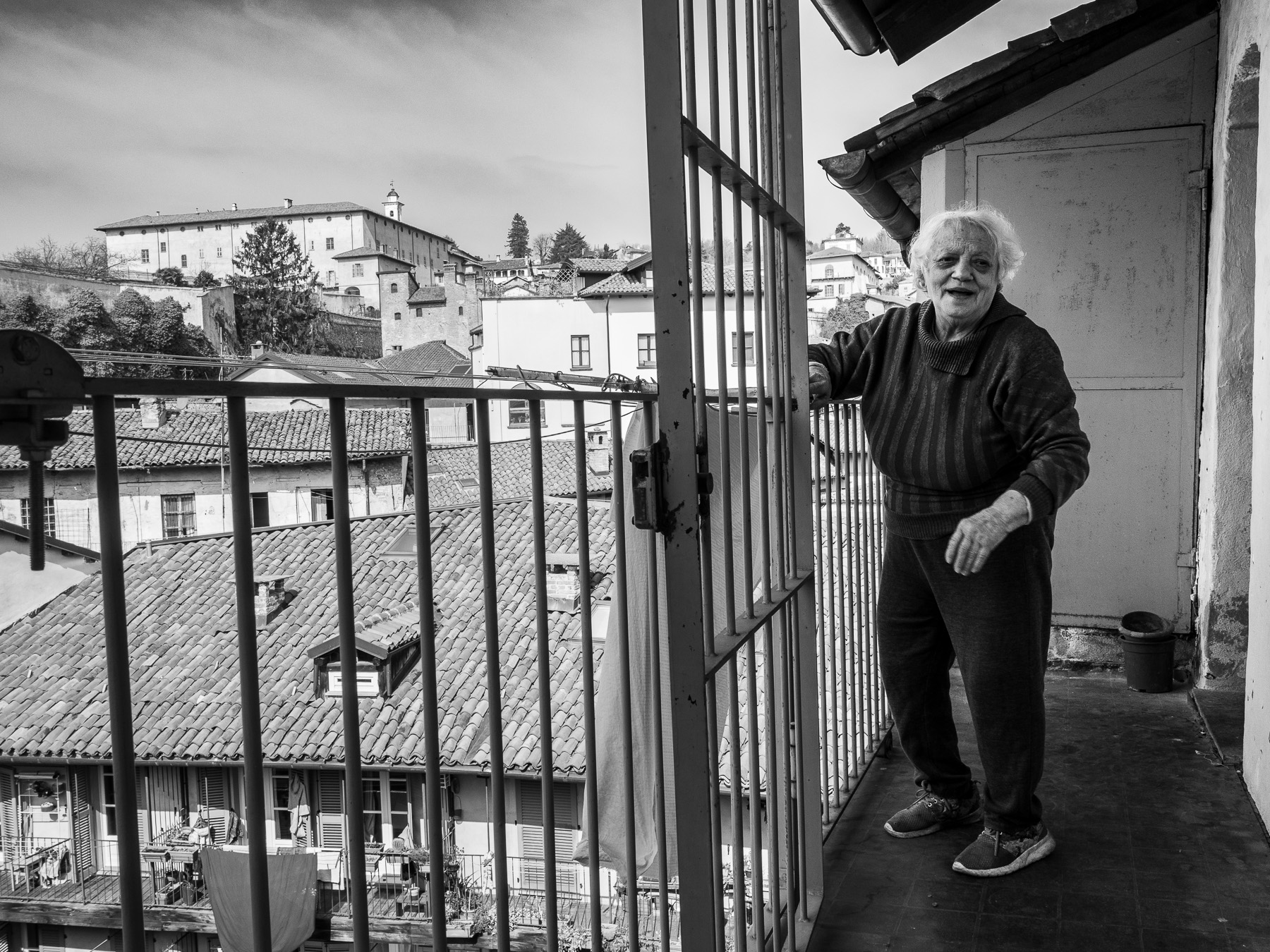 Hai colto una bella espressione della signora Angela. Ne hai colto e raccontato una sfumatura dolce ma al tempo stesso energica e divertita. Il suo sorriso è genuino e il fatto di averla rappresenta circondandola della sua realtà, rende tutto più vero . È grintosa e accomodante, colpisce il suo look , con le scarpe sportive ai piedi,segno di una ricerca di comodità nello sfogare le energie dello spirito di un corpo magari con qualche acciacco.