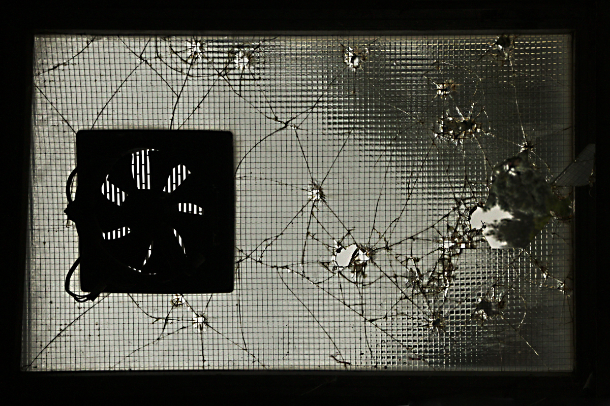A sx sulla linea dei terzi, in un profondo nero, la ventola; a dx una ragnatela di linee causate dal vetro rotto e un po di buchi, di cui il più grande in linea con la ventola. Il tutto immerso in un reticolo.