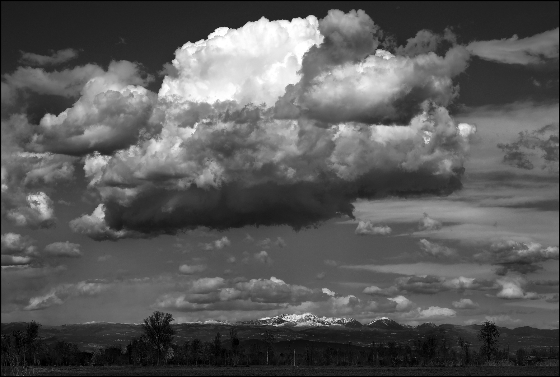 | Un bel cielo imponente rende spaurito il paesaggio montano in basso. Bel bianco e nero. Ciao, Tiziano |