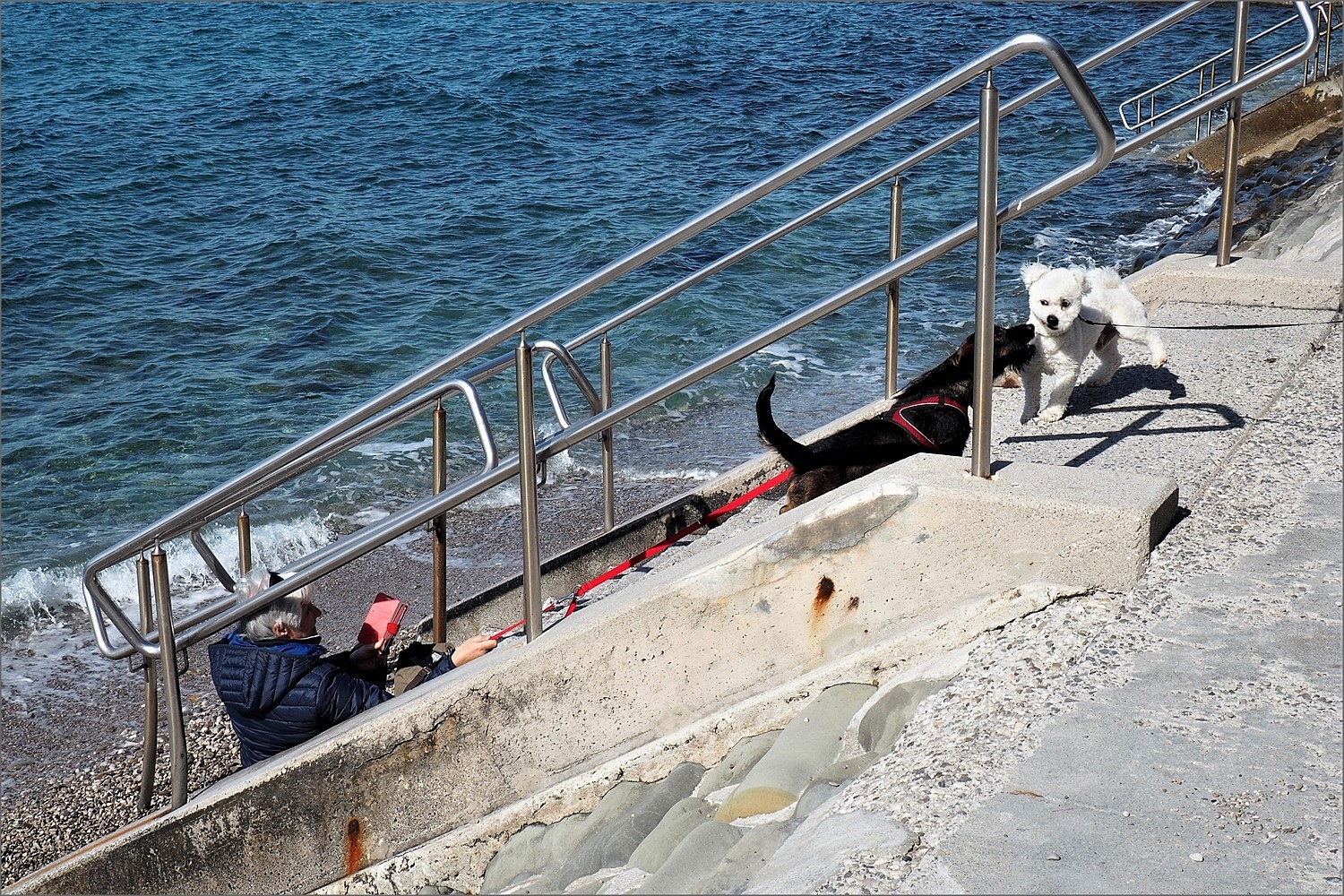 Il resto della foto lo fa la signora con lo sguardo indirizzato verso i cani, la cinghia e l'agenda rossa che rompono i colori freddi della scena