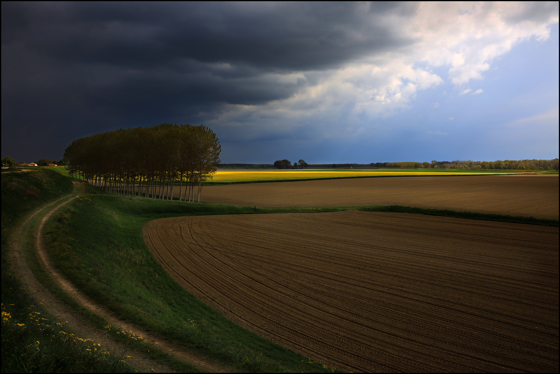 Davvero spettacolare questa lama di luce che fende le nuvole e che va a opportunamente a colpire il campo in giallo.