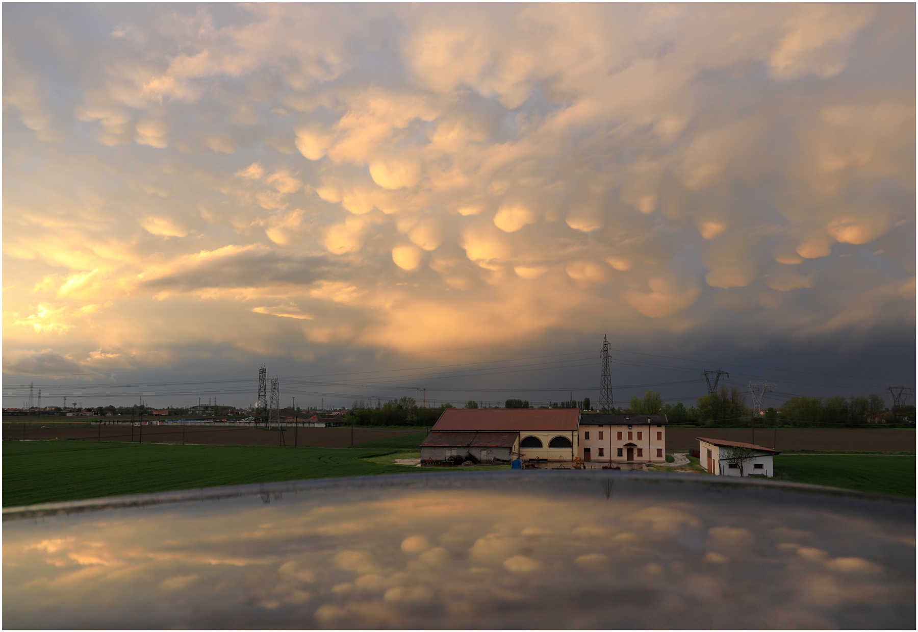 Lo scatto funziona benissimo anche così: quelle nuvole e il suo riflesso racchiudono la fattoria, i tralicci e la campagna che da sole sarebbero state uno scatto"normale".