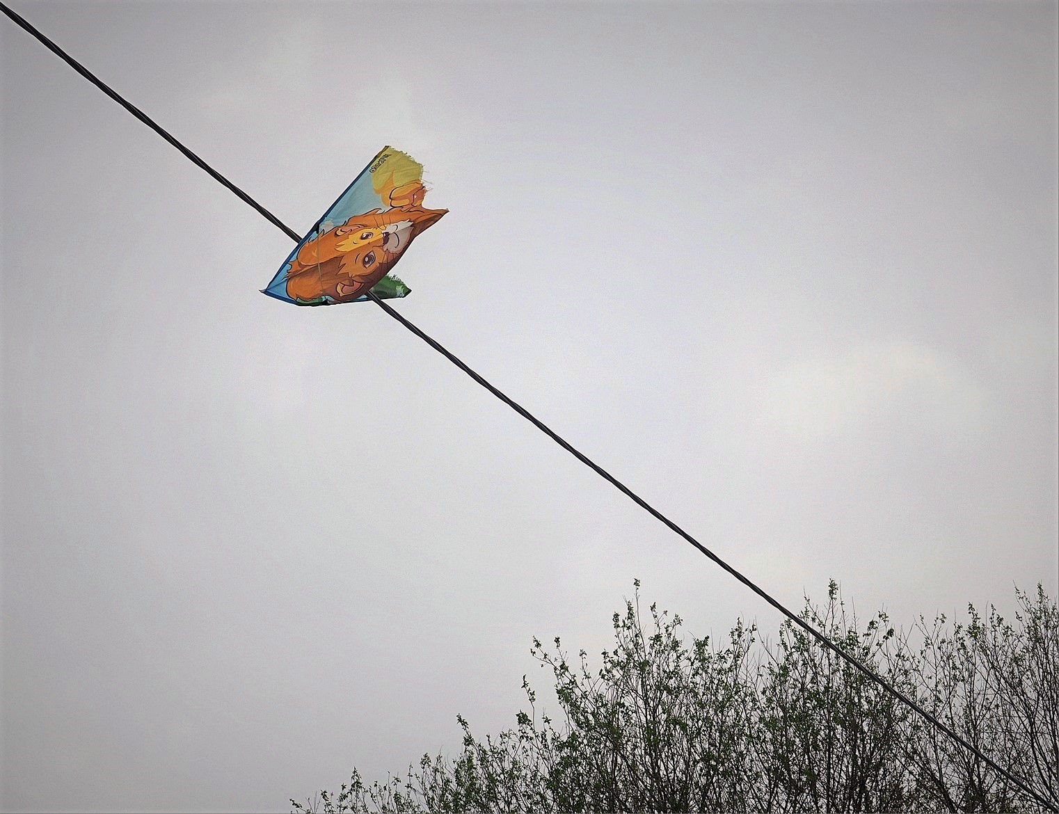 L'aquilone ben posizionato sul terzo superiore, con il cavo che taglia il frame in diagonale esattamente in due, è un buon esempio di composizione.