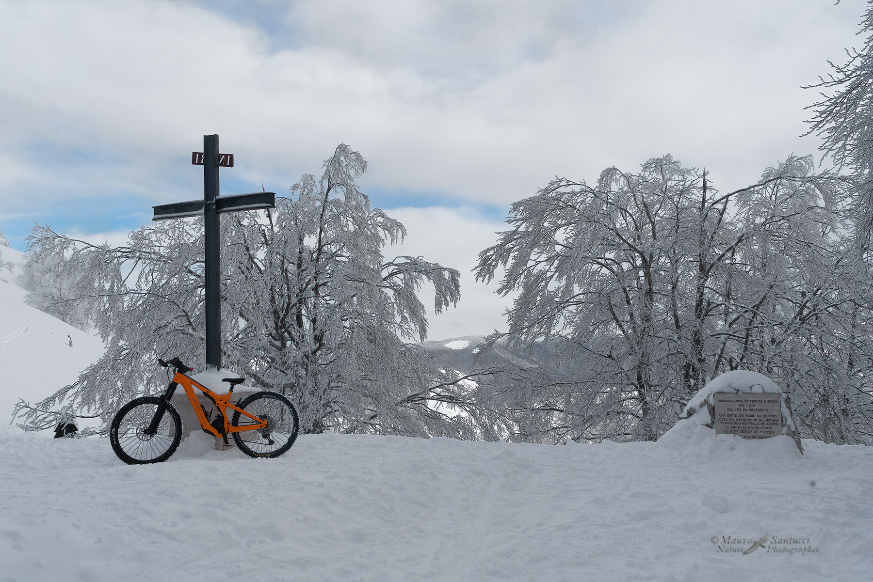 L'inquadratura con al centro gli alberi carichi di neve e ai lati la bici sotto una croce e una targa ricordo è efficace.