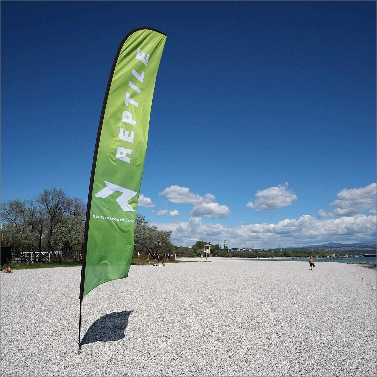 Una grande distesa di sabbia con qualche bagnante, la torretta e poi le montagne con delle belle nuvole che adornano il cielo. In primo piano una bandiera che si allunga verso il cielo creando un bel contrasto.