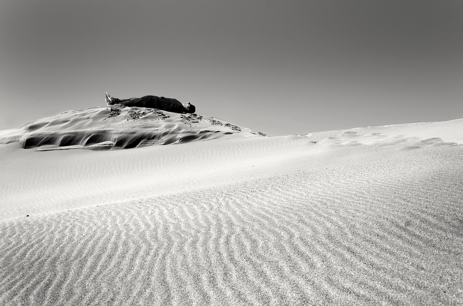 Molto gradevole la texture che il vento ha creato sulla sabbia che guida l'osservatore verso la figura umana splendidamente posizionata.