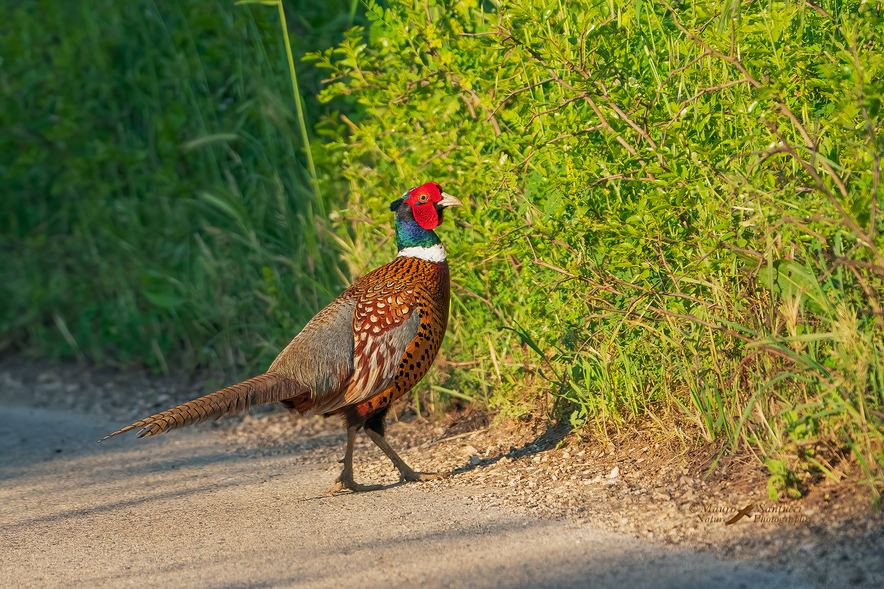 un fagiano reale adulto con la sua colorazione del piumaggio in bellavista, spesso si trovano a terra, non sono dei grandi "volatori", curiosità personale, perché 3200 iso e 1/6000s per un fagiano a terra?