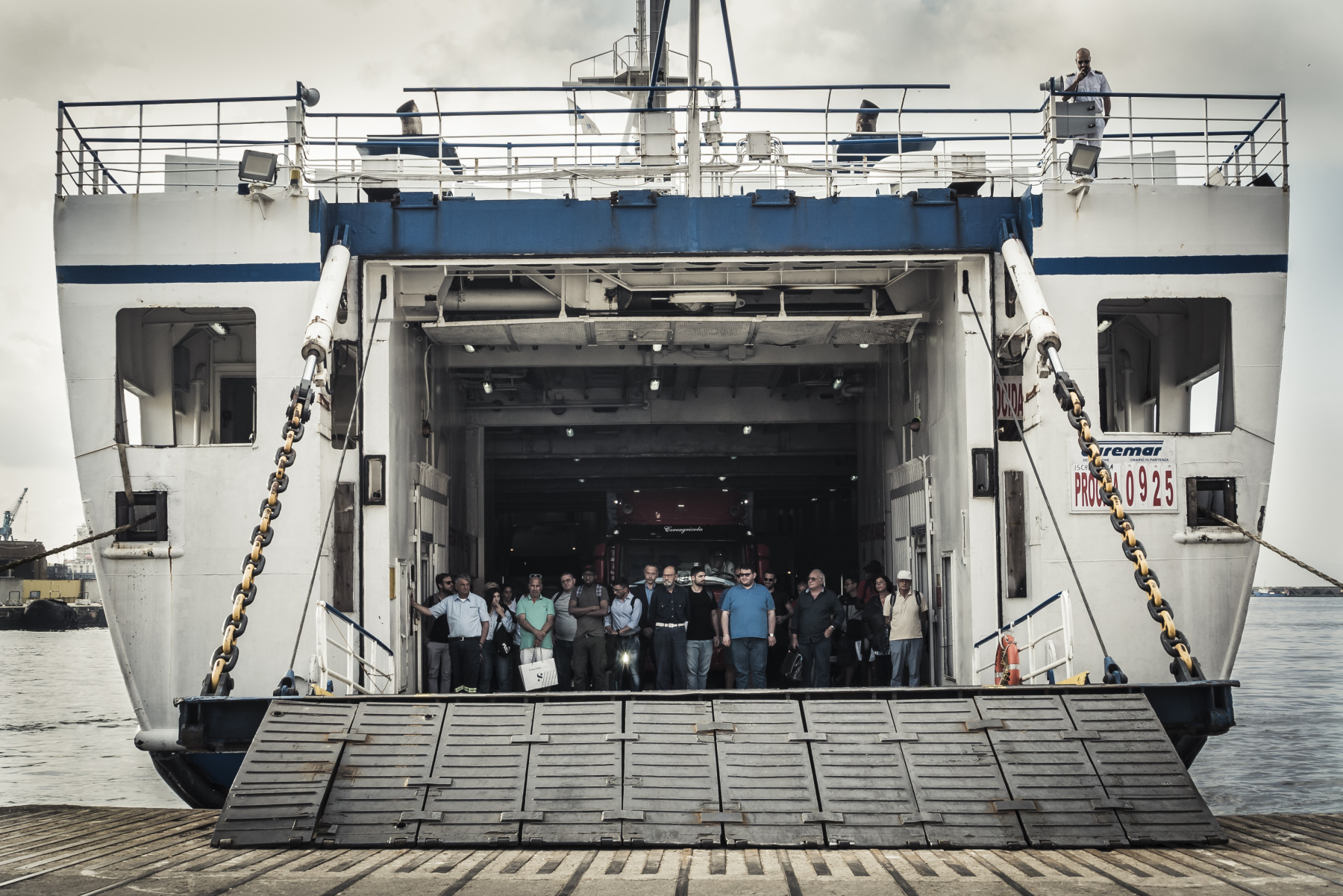 Quante volte da ragazzo ho assistitio a questa operazione nel porto di Cagliari! Allora volare in aereo era realmente elitario ed i sardi andavano nel "continente" con il traghetto!!! Una volta alla settimana arrivava quello da Tunisi ed era per me come la porta su un mondo molto diverso anche se non lontano fisicamente. Per gli umani qui ritratti, probabilmente isolani del golfo, sembra tutto molto di routine e paiono quasi cavalli scalpitanti sulla linea di partenza pronti a riversarsi nella città.