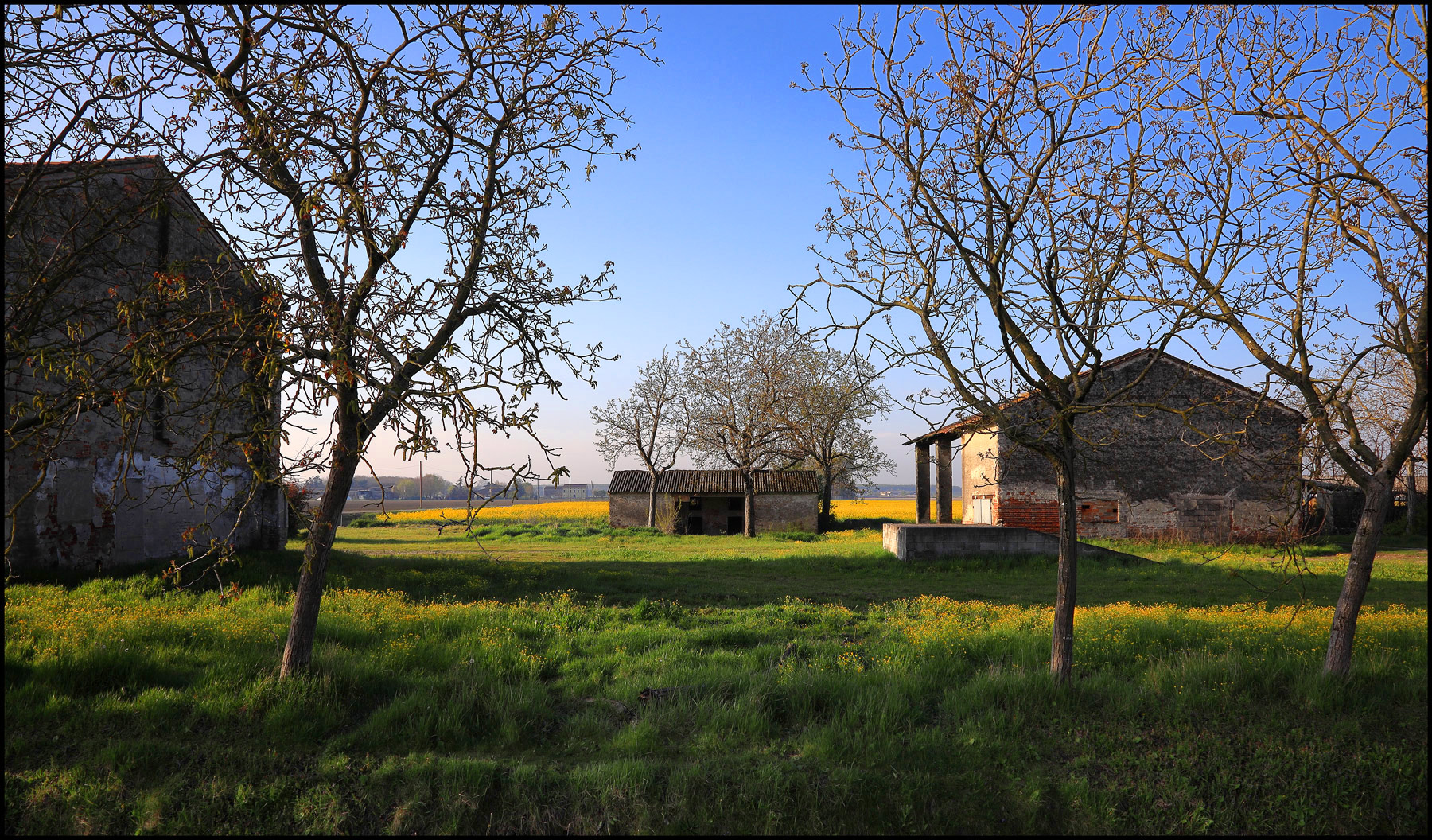Gli elementi: alberi, cascine ben collocati e con lo sfondo attenuato rendono lo scenario godibilissimo.
