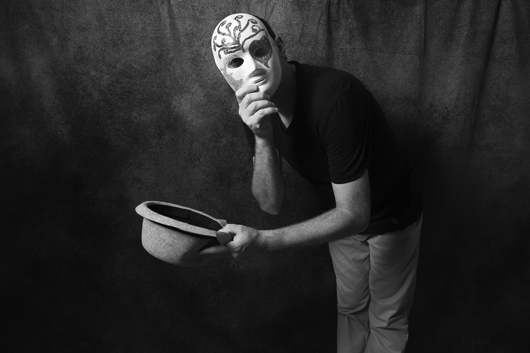 C'è un bel dialogo tra la maschera che prende il posto del cappello e in una dinamica cinematografica si potrebbe immaginare che il soggetto si metta e si tolga la maschera alternandola con il cappello, mutando così di continuo l'identità del personaggio.