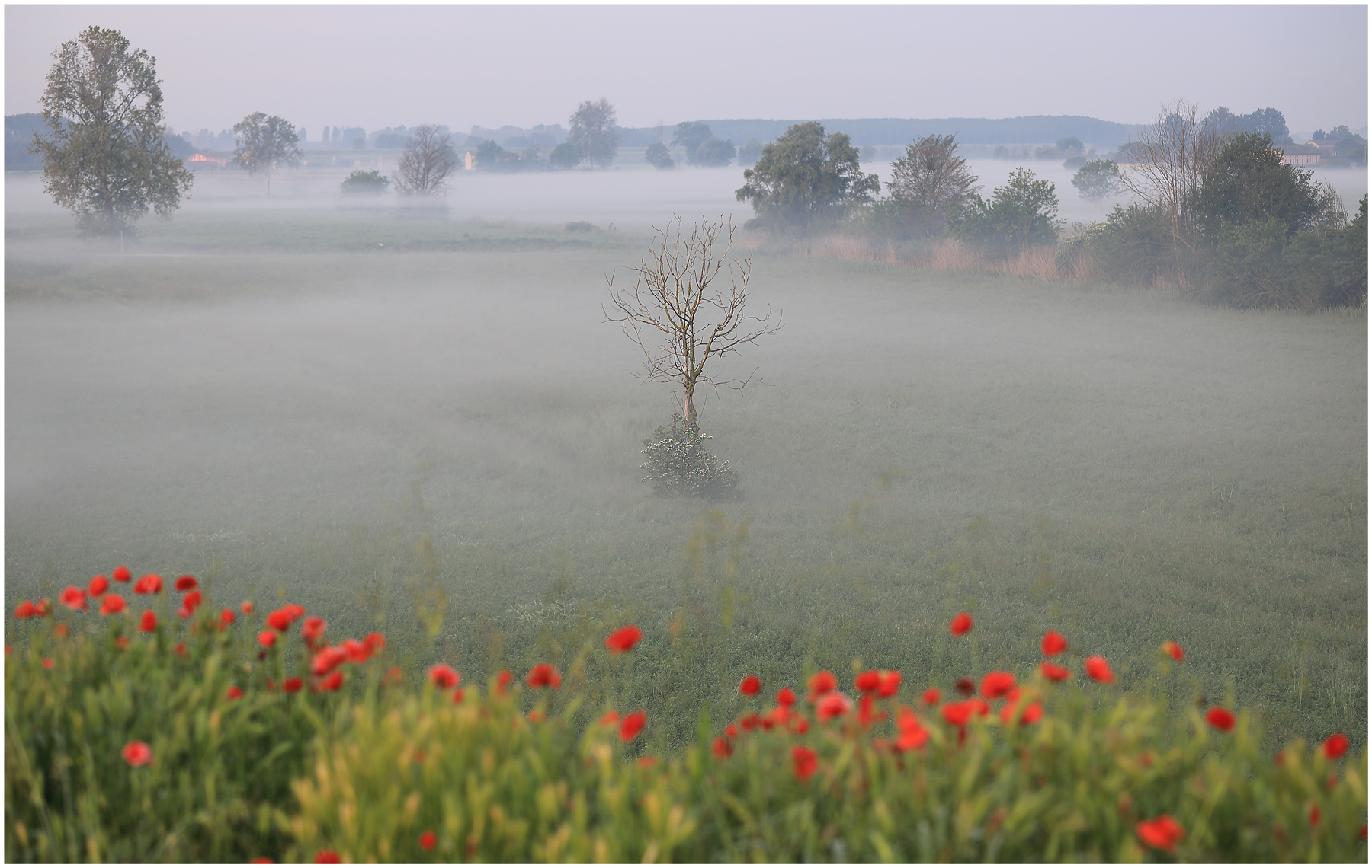L'albero centrale sembra fluttuare nel nulla, piacevoli i papaveri in primo piano.